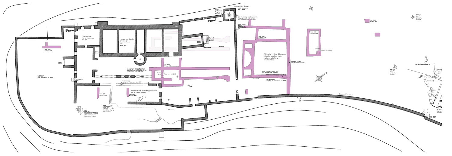 Stellenweise ist in den Radardaten noch heute eine Aufteilung in einzelne Räume identifizierbar. Da jedoch wegen der bestehenden Mauerreste des Schlosses keiner der Klosterflügel komplett prospektiert werden konnte, ist keine Funktionszuordnung der Räume möglich. Auch die exakte Größe des Hirsauer Klosters auf dem Schönrain lässt sich deshalb nur grob abschätzen, da lediglich im Norden die mutmaßliche Außenmauer der Anlage erfasst werden konnte. Unter Annahme eines ursprünglichen Zugangs zum Plateau von Südosten her, der aus fortifikatorischen Gründen am plausibelsten ist, können die Fundamente nördlich der Kirche als Klausurbereich gedeutet werden (5), diejenigen im Süden stellen dann die zugehörigen Wirtschaftsgebäude dar. Ein Grundriss mit annährend östlich an die Kirchenapsis anschließender Klausur ist auch aus Heiligenberg (bei Heidelberg) und Kastl (Lkr. Amberg-Sulzbach) bekannt. Auch bei diesen Hirsauer Klöstern lässt die Lage auf einem Bergsporn keine andere Anordnung zu.